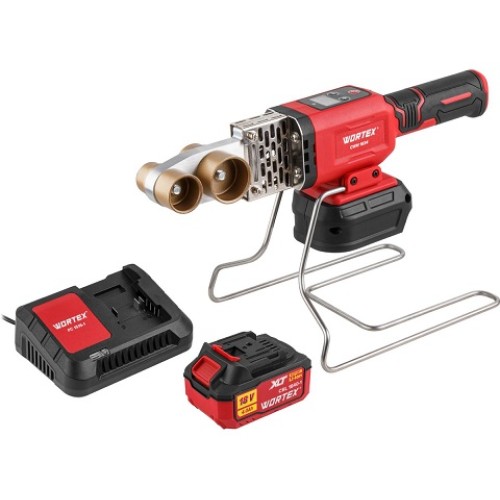 Благодаря электронной регулировке температуры, аккумуляторный сварочный аппарат подойдёт для сварки полимерных труб, изготовленных из любых термопластических материалов. Качество работы обеспечивается низким колебанием температур. В комплекте, помимо лёгкой и устойчивой подставки, присутствуют тефлоновые насадки трёх разных диаметров. Текущая и заданная температуры отображаются на LED дисплее устройства. Для безопасности устройство не начинает нагрев, если не установлена насадка.