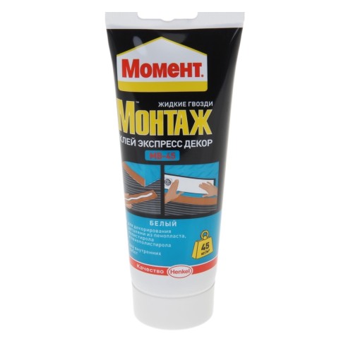 Момент Монтаж Экспресс Декор МВ-45 - монтажный клей для декорирования деталями из пенопласта, пенополистирола и полистирола. Первоначальная сила склеивания - 45 кг.м². Надежное и стойкое крепление декоративных элементов интерьера. Клей разработан специально для склеивания широкого спектра конструкций внутри помещения. Обеспечивает быстрое и надёжное соединение таких материалов, как стиропор, дерево, металл, ПВХ, керамика, ДСП, МДФ, гипсокартон, пробка, полистирол, пенопласт, гипс и другие подобные материалы. Используется для приклеивания: Стеновых панелей, Изоляционных панелей, декоративных деталей, профилей, Установка подоконников и дверных рам, Приклеивания плинтусов и декоративных фризов. Экологически чистый, без запаха. Возможность окрашивания