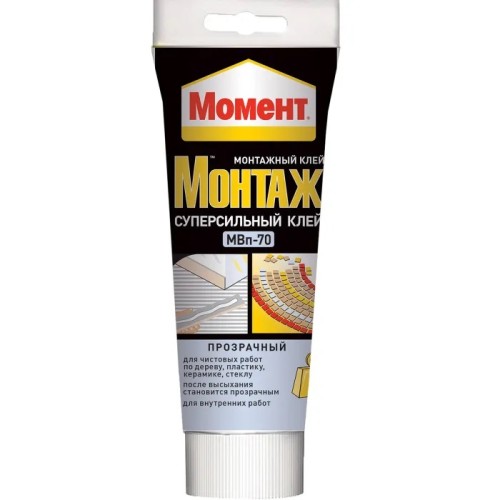 Момент Монтаж Суперсильный Прозрачный МВп-70 - монтажный клей для чистовых работ по дереву, пластику, керамике и стеклу. Повышенная прочность крепления. Первоначальная сила склеивания - 70 кг/м². Прозрачный после высыхания Рекомендуется для использования внутри помещения. Склеивает большинство материалов. Клей на водной основе (одна из поверхностей должна быть пористой или впитывать влагу). Экологически чистый, без запаха. После отверждения клей возможно окрашивать. Склеивает такие материалы как дерево, металл, ПВХ, керамику, ДСП, МДФ, гипсокартон, пробку, полистирол, пенопласт, гипс и другие подобные материалы. Используется для приклеивания: стеновых панелей из дерева, ПВХ, пробки, гипсокартон, изоляционных панелей, декоративных деталей, профилей, установка подоконников и дверных рам, приклеивания плинтусов и декоративных фризов.