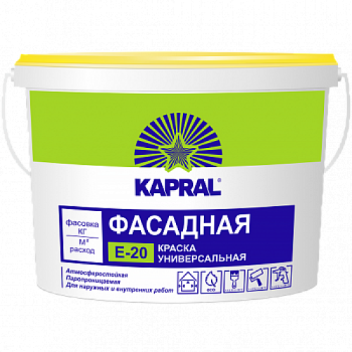 Декоративная краска Kapral E-20 белого цвета используется для создания декоративно-защитных покрытий фасадов и интерьеров. Может применяться для малярных работ внутри помещений с повышенной влажностью воздуха и высокими эксплуатационными требованиями. Подходит для нанесения по бетону, цементно-волокнистым плитам, штукатурке, шпатлевке, кирпичной кладке, гипсокартону, а также на ранее окрашенных водно-дисперсионными красками поверхностях. Легко наносится, образуя покрытие устойчивое к воздействию неблагоприятных погодных условий. Скрывает мелкие неровности поверхности. Тонируется машинной колеровкой по системе Eskarocolor. Покрытие устойчиво к воздействию влаги через 24 ч после нанесения. Расход составляет 300-350 г/м2 при 2-слойном нанесении. Время высыхания — 4-6 ч при температуре (20 ± 2) C и относительной влажности воздуха (65 ± 5) %. В ведре — 7,5 кг краски.