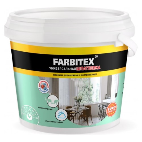 Акриловая шпатлевка Farbitex (для наружных и внутренних работ; 3.5 кг) 4300001567 предназначена для исправления дефектов и создания гладкой поверхности для последующей отделки на кирпичных, бетонных, оштукатуренных, гипсовых, других минеральных и деревянных поверхностях. Подходит для внутренней отделки помещений с повышенной влажностью.