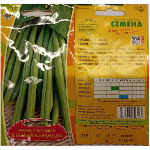 Фасоль спаржевая Зеленый карандаш (5гр.) ИП СЕМЕНА. Сорт высокоурожайный, скороспелый, период от посева до сбора урожая 70 дней. Бобы длиной до 20 см, диаметром 12 мм, фиолетового цвета, сочные, мягкие, нежного вкуса. Предназначен для всех видов потребления и переработки.
